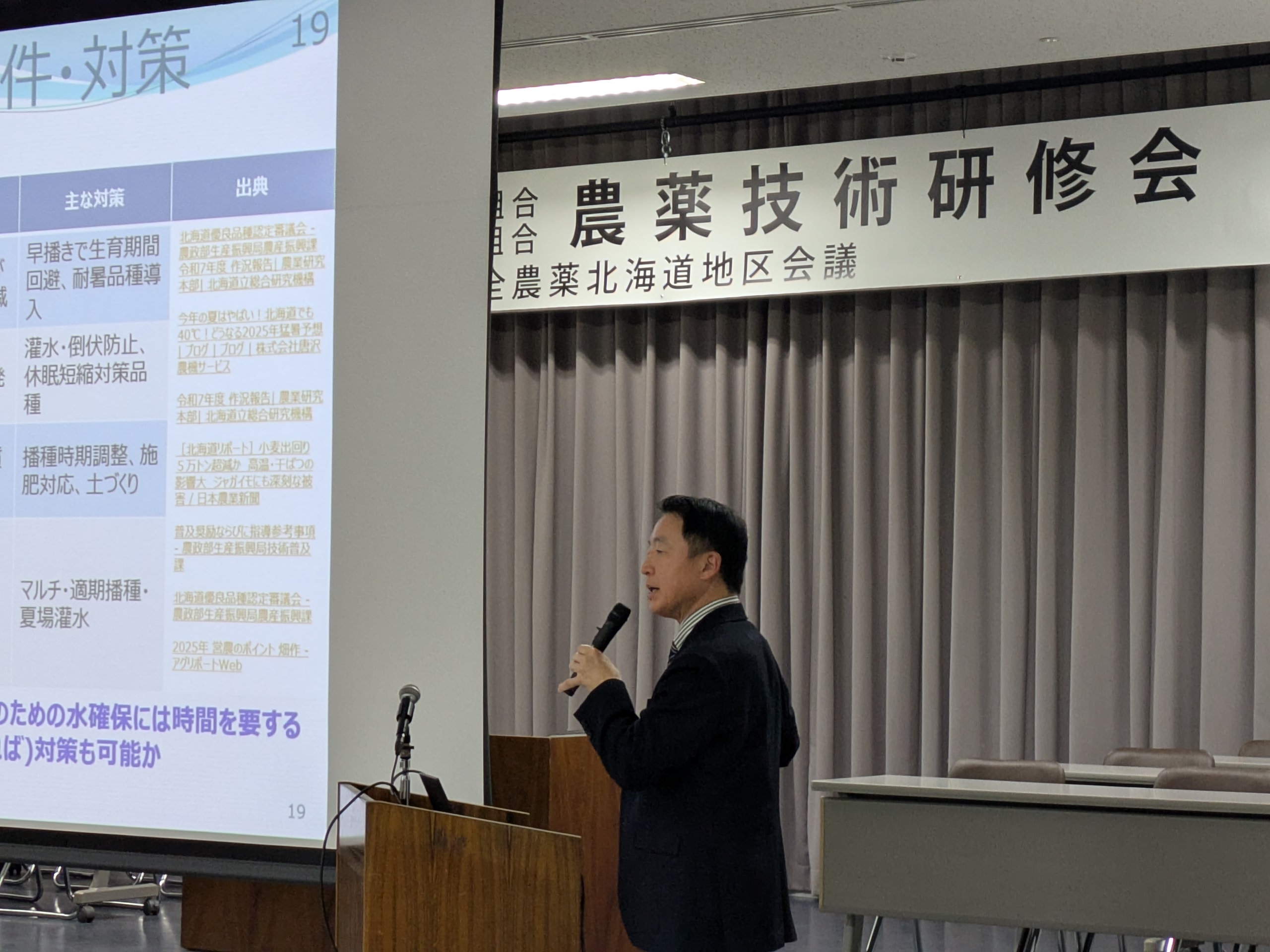 当日札幌は低気圧の影響で猛吹雪となる中での開催となってしまいましたが、北海道の農薬販売に関わる方々約120名が集い、農薬をめぐる最近の動向について、気候変動と気象予報について、今後注意する病害虫についてなど、多くのテーマで研修を受けました。